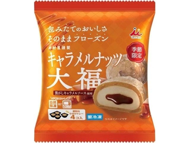 ①「冷凍和菓子4コ入シリーズ」初!ナッツの食感がアクセントのもち生地 生地にアクセントを取り入れる試みは、「冷凍和菓子4コ入シリーズ」では初となります。ナッツは香ばしくローストし、細かく砕いた歯触りの良い粒感のアーモンドを使用。もち粉は、国産品を選定し、やわらかでありながらコシのある歯切れの良いもち生地に仕上げました。 ②優しいミルク風味を感じられるミルクあんとほろ苦い焦がしキャラメルソース 白あんをベースに練乳などで味付けをしたミルクあんは優しいミルク風味を感じられ、中心に入っている焦がしキャラメルソースと相性抜群です。焦がしキャラメルソースは、じっくりと熱をかけて焦がした砂糖の香ばしさと生クリームのコクと深い味わいが特長で、洋菓子専門店で使われているような本格的な焦がしキャラメルソースをお召し上がりいただけます。 ③ミルクあんと焦がしキャラメルソースが堪能できる、あんともち生地のバランス ミルクあんと焦がしキャラメルソースを堪能いただくために、重量比率の半分以上があんとソースになっています。こだわりのもち生地とたっぷりのミルクあん、そして焦がしキャラメルソースのバランスをお楽しみください。