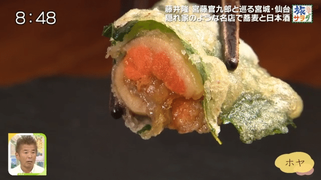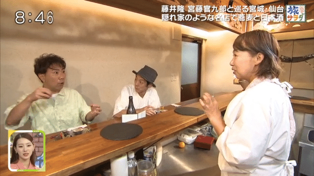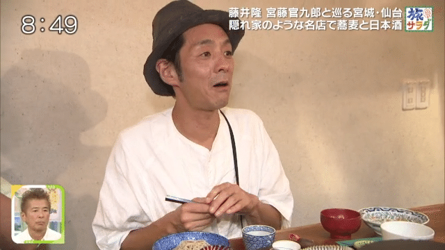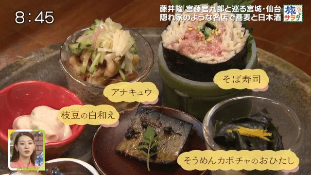 蕎麦味噌、ニシンの山椒煮、磯つぶ旨煮といった、宮城県の幸で作った前菜盛り合わせに、宮藤と藤井は「うわ~すごいな~!」「面白い!」「1個食べきるのもったいない!」などと感動! ホヤや女川のカキなど地元食材の天ぷら、メインのこだわり十割蕎麦、それら料理と味わう東北の日本酒に対しても、彼らは何度も「うわ~おいし~!」とうなった。