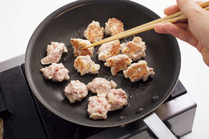 肉だねは手でつまむようにして、フライパンに並べていけばOK。丸めなくても、れんこんのでんぷん質がつなぎになり、ばらばらになりません。