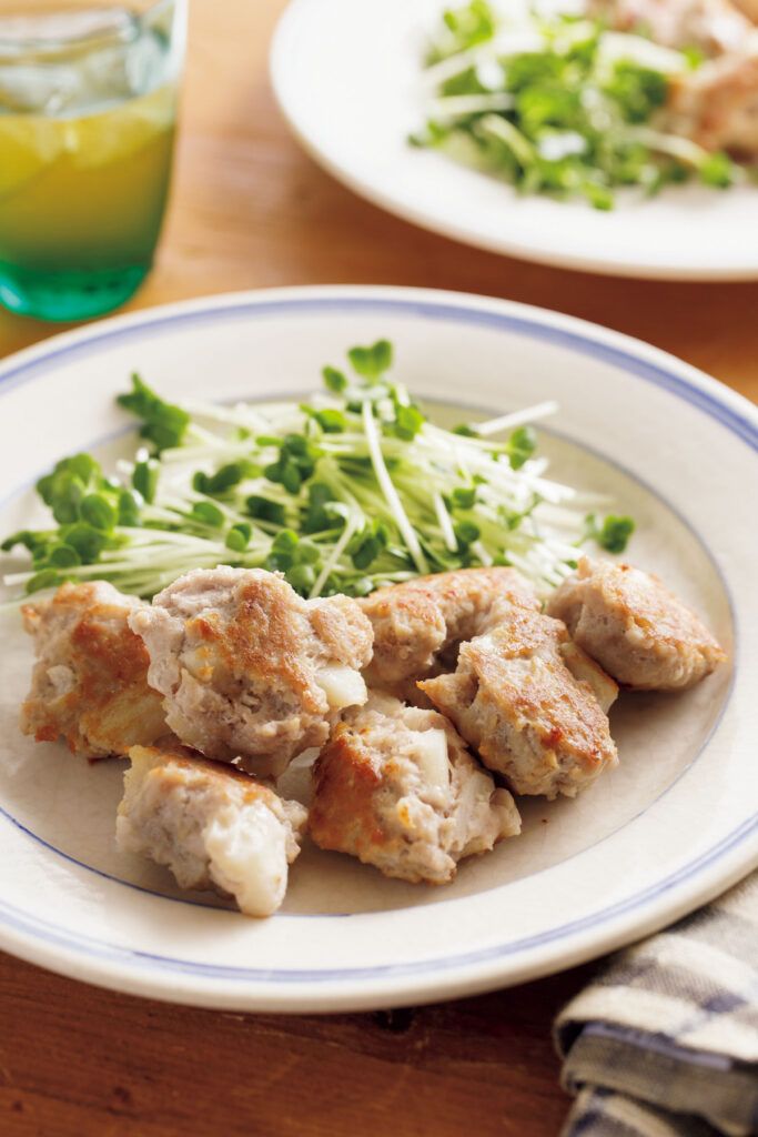(2)フライパンにサラダ油大さじ1を入れて広げ、(1)の肉だねを1/14~1/12量ずつちぎり入れる。ふたをして強めの中火にかけ、3~4分焼く。ふたを取って返し、そのまま2~3分焼く。器に盛り、貝割れ菜を添える。