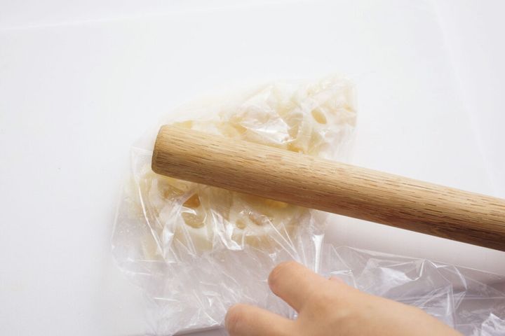 (1)れんこんは皮をむき、縦4等分に切ってポリ袋に入れ、めん棒などで1cm角くらいになるようにたたく。ひき肉、しょうが、しょうゆ小さじ1、塩小さじ1/3を加えてもみ混ぜ、肉だねを作る。貝割れ菜は根元を切る。