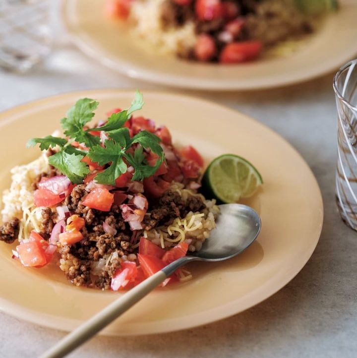 スパイスが香るひき肉をたくさんのせ、大満足の一皿へ。フレッシュなサルサと混ぜて食べればヤミツキになる。