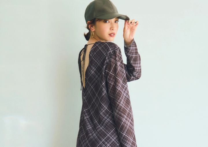 ミルクブラウンとラベンダーのまろやかなチェックに、バックオープンデザインの意外性が心をくすぐる!セクシーに転ばないよう、パンツレイヤードやキャップで力が入りすぎない塩梅に。