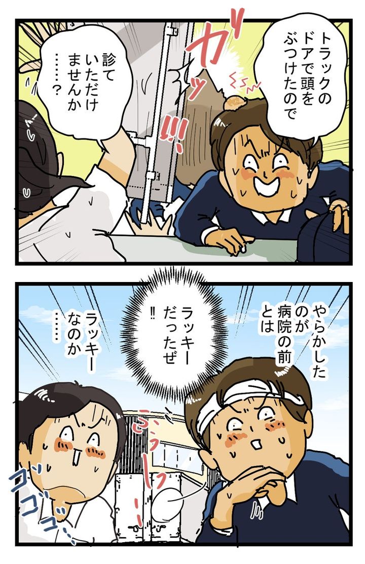 宅配便を受け取ったはいいものの、配達員は慌てた様子ですぐに戻ってきました。すると、配達員は「トラックのドアで頭をぶつけたので診ていただけませんか……?」と、尋ねてきたのです。配達員は、やらかしたのが病院の前とはラッキーだったぜ!!とホッとした様子ですが、果たしてそれは「ラッキーなのか……」と、疑問の表情を隠せない病院の女性でした…。