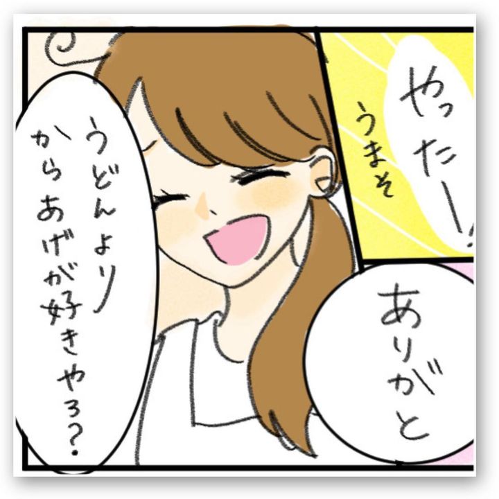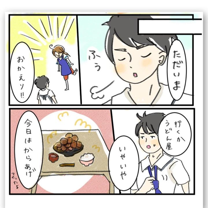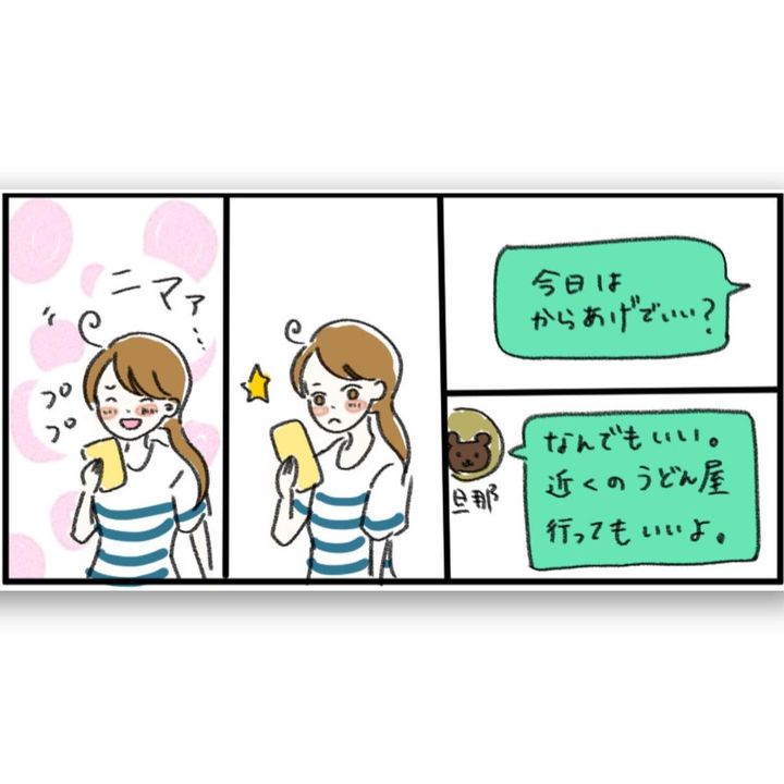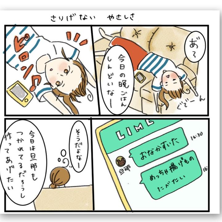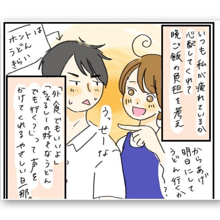 夕食を作るのが億劫なちぇるしーさんでしたが、旦那さんから、「おなかすいた めっちゃ揚げものたべたい」と連絡が。「今日はからあげでいい?」と聞くと、「なんでもいい。近くのうどん屋行ってもいいよ」と、ちぇるーさんの負担を気遣ってくれるのでした。