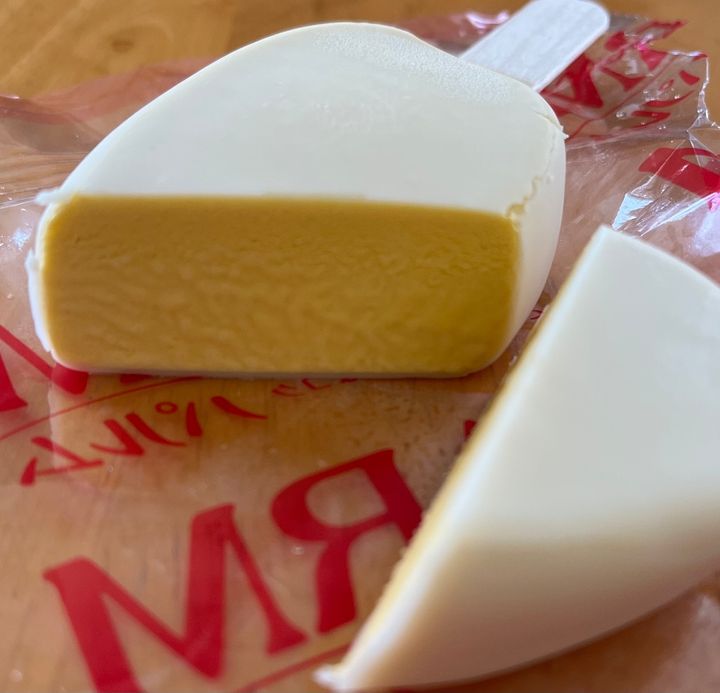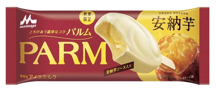 安納芋アイスに安納芋ソースをスワール状(うずまき状)に充填し、口どけの良いなめらかなホワイトチョコでコーティング。