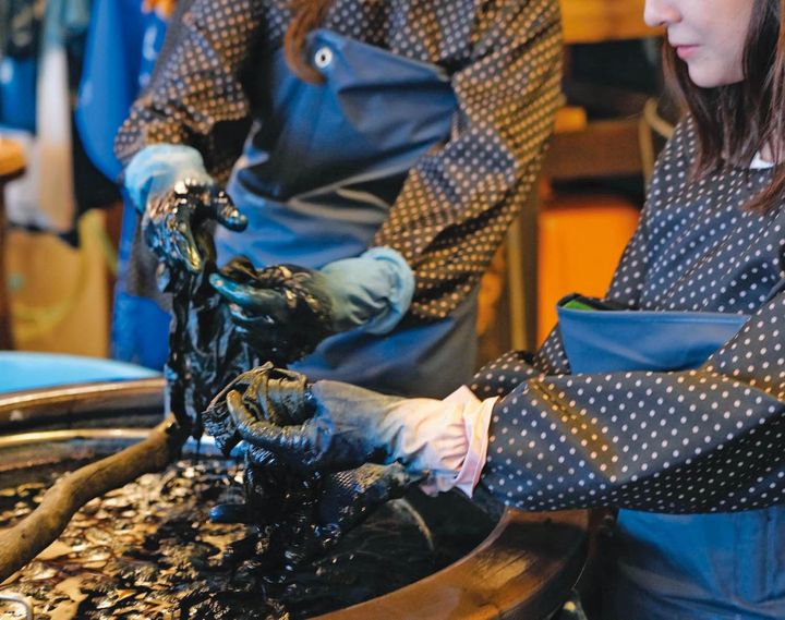 江戸時代から受け継がれる伝統の技で作られた藍の染液。これを使って染め上げた瞬間の感動と達成感は、旅の思い出として心に残る。