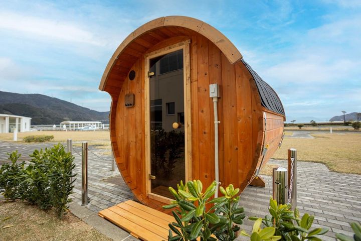 新設された、低温設定のバレルサウナ。外気浴が楽しめる専用スペースも。
