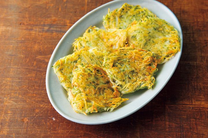 じゃがいも2個で作る、人気の韓国料理「チヂミ」風の一品。青のりの風味が香る、あっさり味の副菜です。