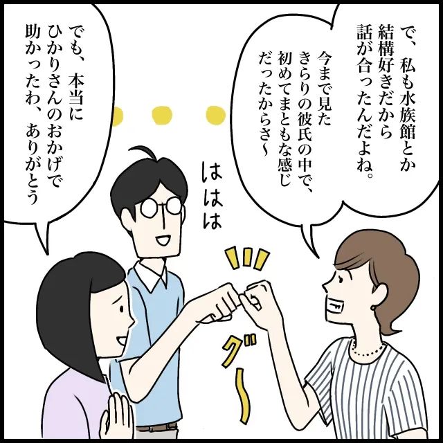 「で、私も水族館とか結構好きだから話が合ったんだよね。今まで見たきらりの彼氏の仲で、初めてまともな感じだったからさ~」「ははは」そう言ってグータッチする二人に、「でも、本当にひかりさんのおかげで助かったわ、ありがとう」と静香さんが言うと、