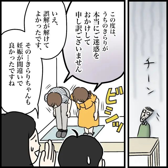 きらりちゃんの一人芝居だと言うことがわかった両親は、「この度は、うちのきらりが本当にご迷惑をおかけして申し訳ございません」と頭を下げて謝罪。すると、「いえ、誤解が解けてよかったです。その・・きらりちゃんも妊娠が間違いで良かったですね」と静香さんが言いました。