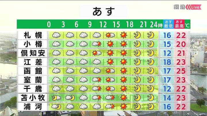 あす18日(木)の時間ごとの天気。道央・道南からです。