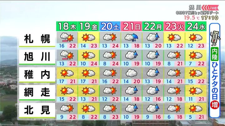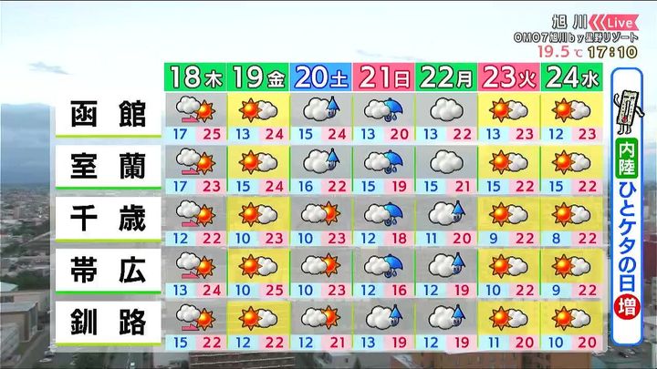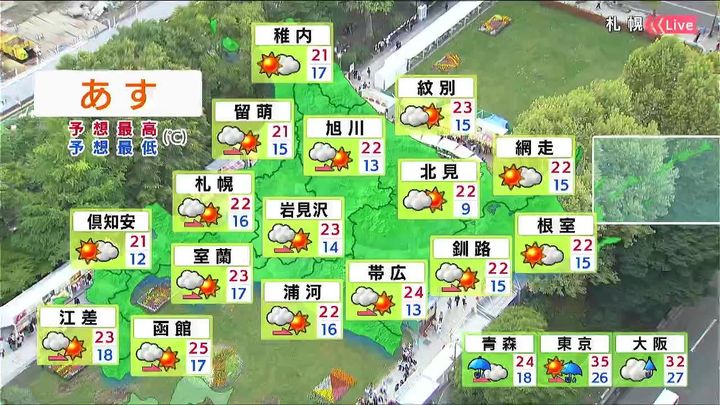 午後を中心に各地で日が差すでしょう。気温はきょう17日(水)より3度前後低く、札幌の最低気温は16度、最高気温は22度です。これでほぼ平年並みですよ。日中は過ごしやすい陽気でしょう。