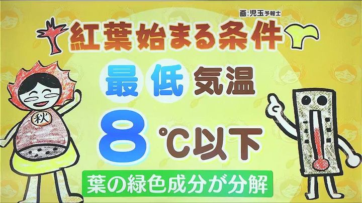 刻みますが、最低気温が8℃以下でした。8℃以下になると葉っぱの緑色の成分が分解されるんです。この先、標高の低い山や内陸でも少しずつ色づきが始まりそうです。