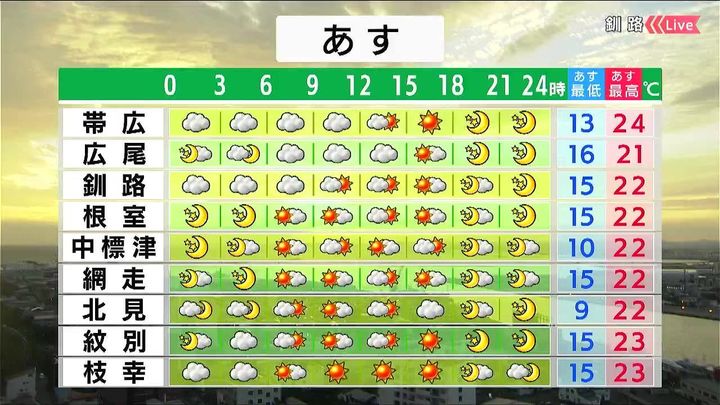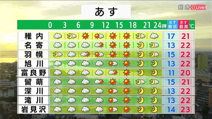 各地で日が差すでしょう。午後は北見周辺など山沿いの一部で弱いにわか雨の可能性があります。朝は北見で9度まで下がりますが、日中は22度くらいでしょう。