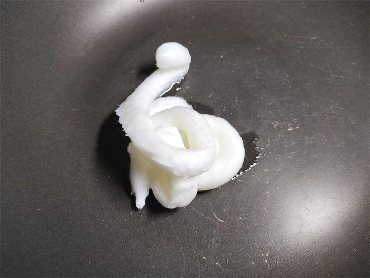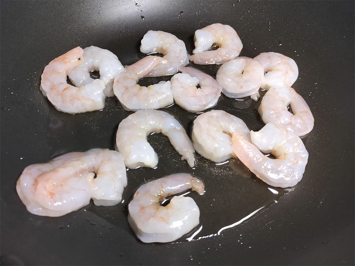 2. ラードが溶けかけたら火を止め、少し落ち着かせてからエビを入れ、弱火で加熱します。途中で中火弱にし、エビが白くなったら火を止めてエビを取り出しておきます。重要なのは、火を入れすぎないことです。