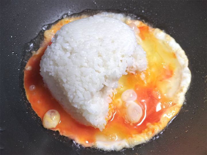 4. 縁が固まり始めたら、ご飯を加えてよく混ぜます。