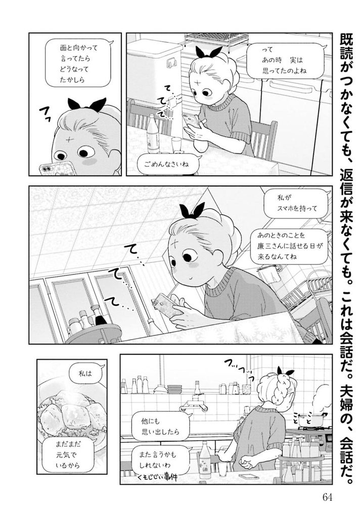 夫を亡くしたばかりのミカコさん・72歳。今後は夫と暮らした家にこだわって一人暮らしをするつもり。心配な子や孫にスマホを持たされたところ、死んだおじいさんのアカウントと偶然繋がってしまい––––。マンガ『ミカコ72歳』(新久千映著/ゼノンコミックス)より、一部を抜粋してお届けします(毎週水曜、金曜の17時、17時5分に配信予定)。©新久千映/コアミックス