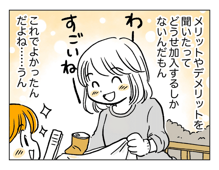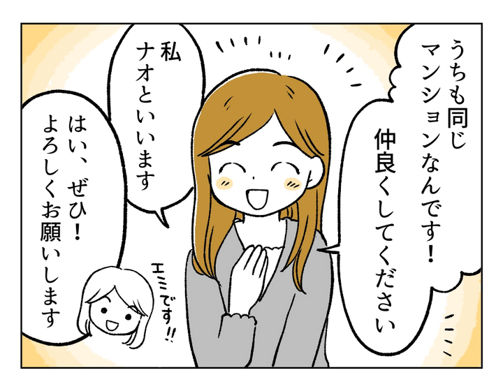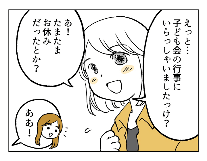 エミさんに声をかけてきたナオさんは、ニコニコしていてとても感じがいいママさんです。しかし、子ども会に加入していないそう。エミさんのイメージだと「参加しないと村八分になるのでは!?」と思っていましたが、目の前のナオさんはママ友が多そうで、社交的な雰囲気を感じています。