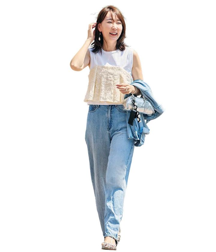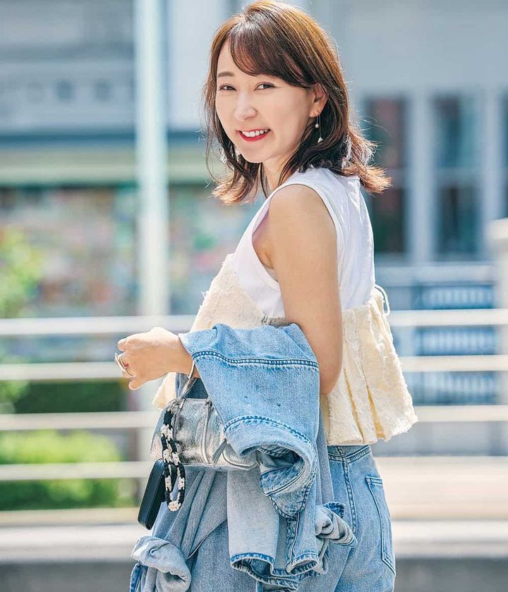 Tシャツ(エトレトウキョウ/ハイブス)ビスチェ(エミ/emmi)デニム・デニムジャケット(ともにアンクレイヴ/アンクレイヴ〈オンワード樫山〉) サンダル (ル タロン)バッグ(ザラ)/すべて本人私物