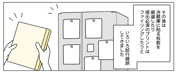 私は夫と、小学1年生の息子(7歳)、保育園に通う娘(3歳)との4人暮らし。息子が小学校に入学してから、日々配布される大量のプリントの管理に悩まされています。クラスだより、学年だより、学校だより、自治体からの連絡、今週の予定表、行事の案内……。大事そうなものは冷蔵庫にマグネットでとめているのですが、何枚も何枚も重なるうちにどれを見ればいいのかわからなくなるのです。そしてまた今日もプリントが増えて……?