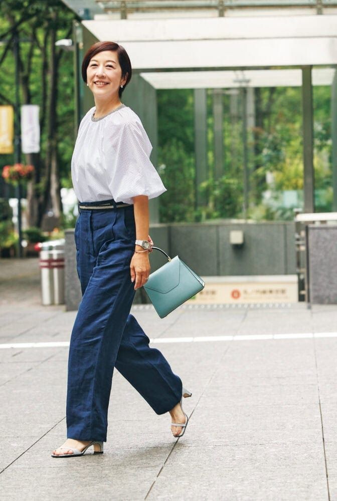 3. 【60代お手本スナップ】正統派パンツスタイルを華やかにするには?バッグやベルトでおしゃれに差をつける!