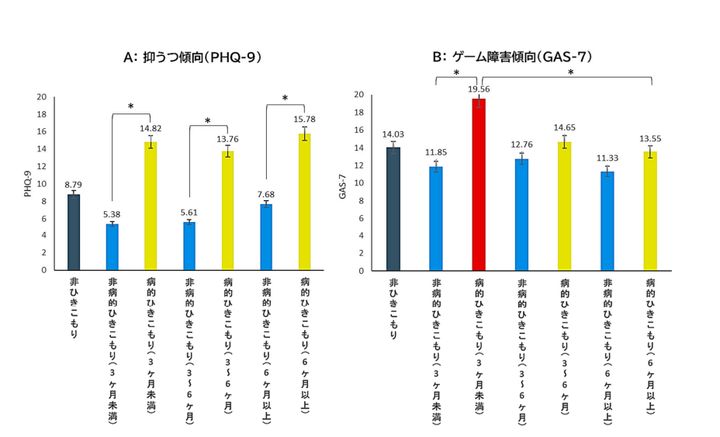 その結果、「病的なひきこもり」ではどの継続期間においても、抑うつ傾向が有意に高くなっていました(上図の左の黄色)。