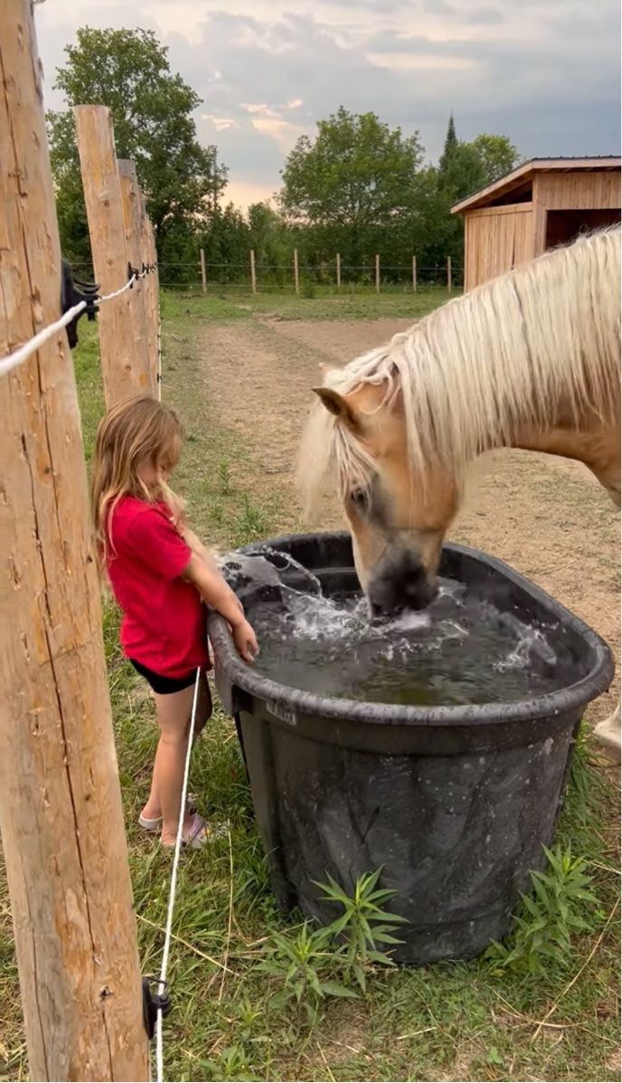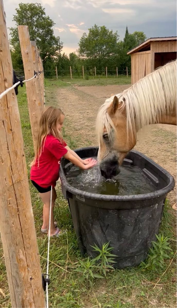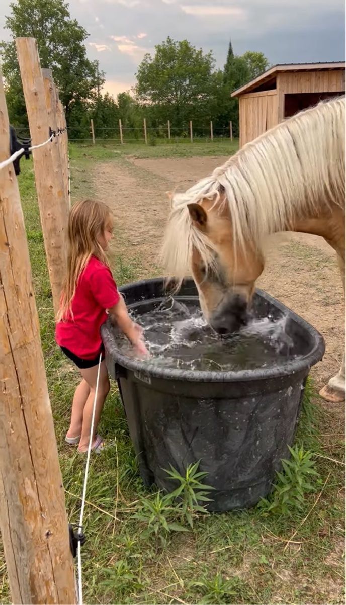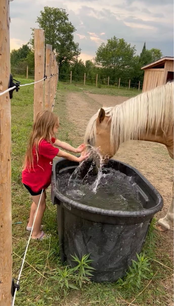 「今度は私の番!」と言わんばかりに、女の子が馬の顔に水をバシャバシャ!