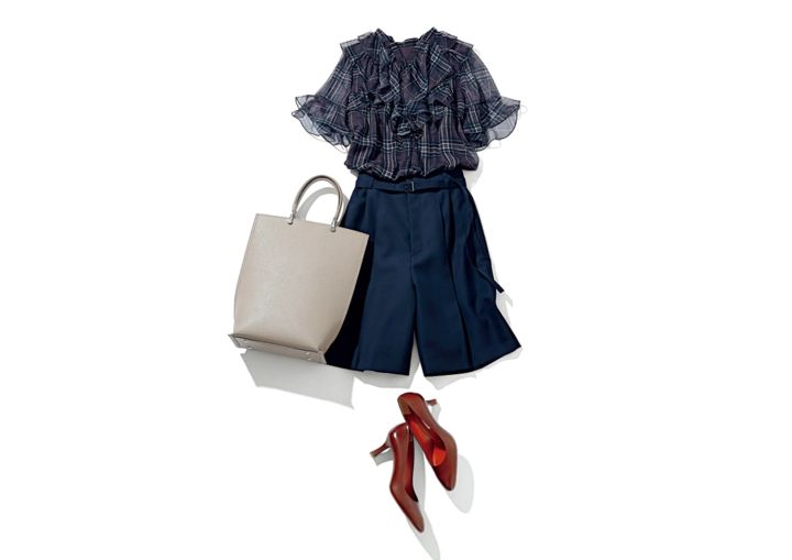 ショートパンツ¥26,400/ドレスレイブ(ジオン商事) チェックブラウス¥18,700/ジャスグリッティー ブラウンパンプス¥19,250/ダイアナ(ダイアナ 銀座本店) トートバッグ¥13,000/PLST