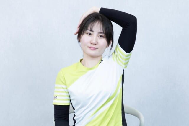 (1)骨盤を立てて背筋を伸ばして座り、左手を右の後頭部に添える