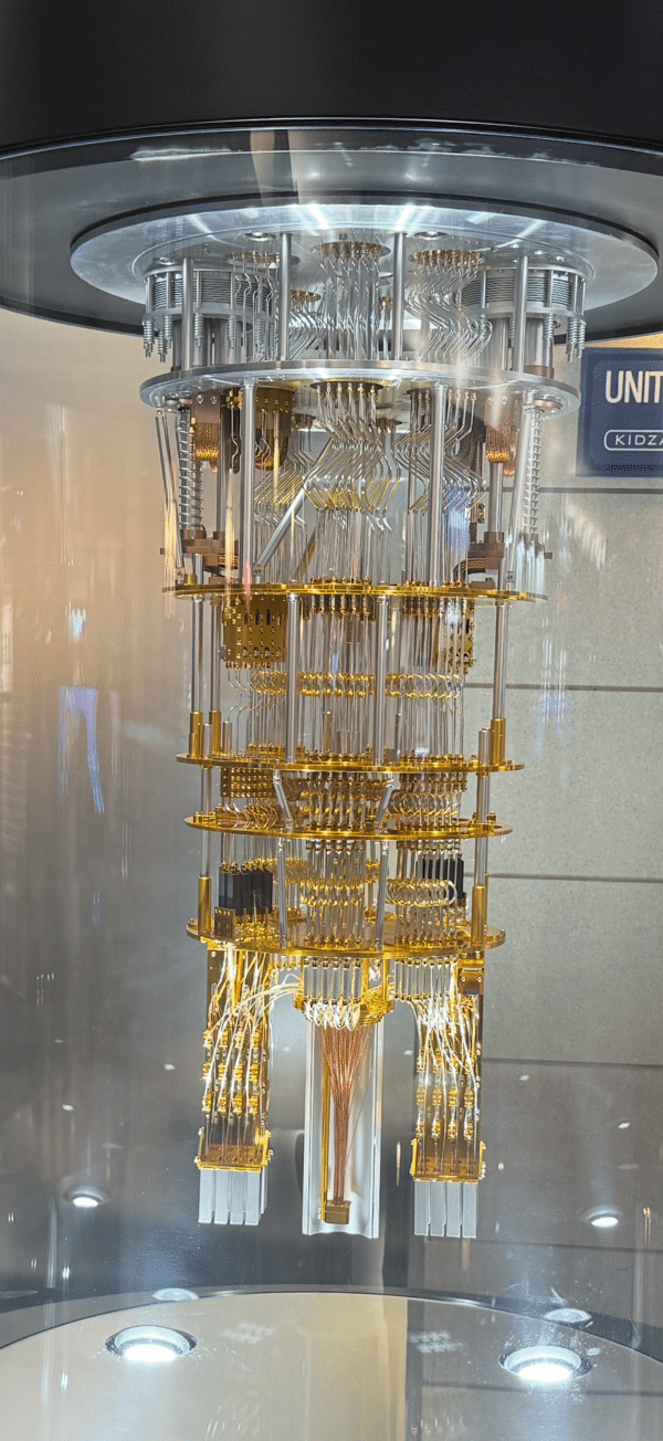 量子コンピュータはある特定の分野ではスーパーコンピュータを遥かに上回る能力を持っているのですが、熱や振動といった外部からの刺激にめっぽう弱い。言わば超箱入り娘(息子?)なのです。よって、それら外部の刺激から厳重に守ってあげなければいけません。この模型の中ほどにあった天国の階段のような美しい階層部は冷却ステージで、下に行くほど温度が下がる仕組みになっています。