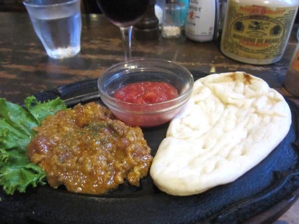 ワインと一緒に食べたいと思って、チリビーンズもオーダーしました。お豆とお肉がじっくりと煮込まれていて、トマトソースと一緒にナンにのせて食べます。お肉の旨味とお豆のしっとりほっくり感で美味しい~、ワインに合う~~。