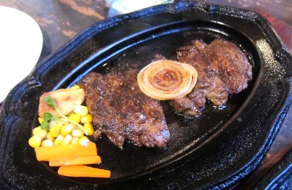 人気No.1のインディアンステーキの150gを頼みました。スパイシーなステーキソースで、お肉が美味しい~~。鉄板でアツアツが嬉しいですね~。