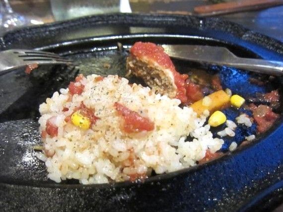 鉄板が空いたら、ライスを入れて、ソースを絡めて食べると美味しいですよと、シェフが教えてくれたのでやってみました。テーブルのブラックペッパーをかけたら、オリジナルソースの美味しいスパイス&ペッパーライスになりました。テーブルの上の調味料で、お好みのライスが出来ちゃいますよ~。