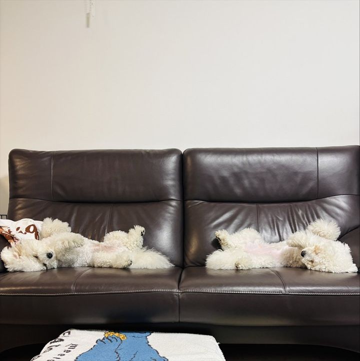 ソファに横になりぐっすり眠っているのは、ビションフリーゼの『はく』くんと『もち』ちゃん。 こちらの写真が撮られる前はそれぞれ違う寝方をしていたとのことですが、振り返ってみたらこうして鏡合わせしたような寝相になっていたのだとか。