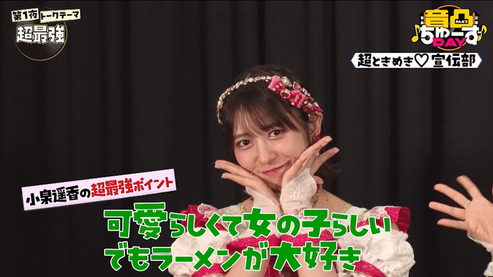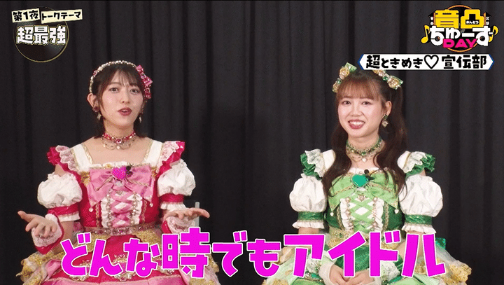 今回、音凸トークに登場してくれたのは超ときめき♡ピンクの“おはる”こと遥香さんと、超ときめき♡グリーンの“ひよりん”ことひよりさん。6つのトークテーマの中から最初にひよりさんが“ちゅーず”したのは「超最強」です。