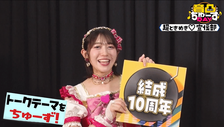 続いて遥香さんがちゅーずしたのは「結成10周年」。下埜が「ここに来るのはそんな簡単な道のりじゃなかったと思います」と言うと、遥香さんは「私たち、初めは期間限定ユニットって言われてて。まさか10周年を迎えるなんて思ってもいなかったし、あきらめずに頑張ってきて良かったなっていう気持ちでいっぱいです」と笑顔を見せました。