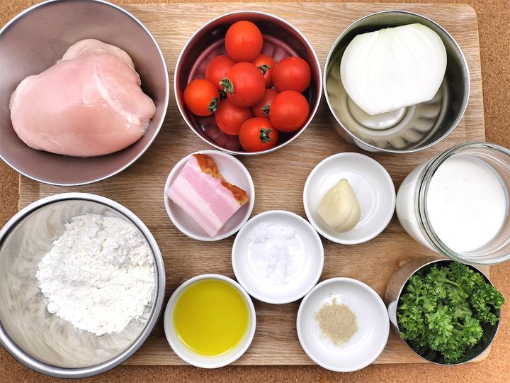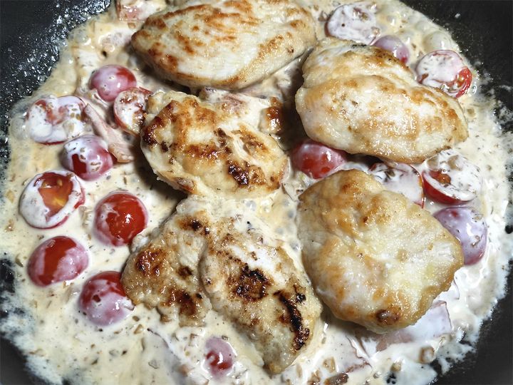 「マリーミー(結婚して!)チキン」という、冗談のようなユーモラスな名前の料理ですが、ベーコン・トマト・生クリームがそろえばおいしくないはずがありません。