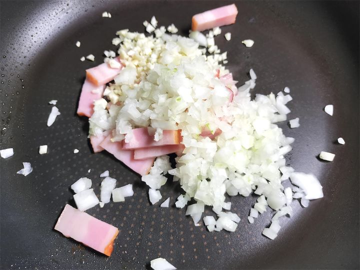 2. フライパンを洗わずに玉ねぎ、にんにく、ベーコンを入れ、強火でじっくり炒めます。