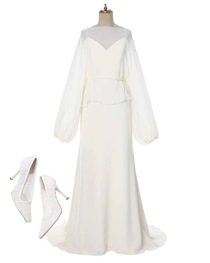 小豆から抽出された染料で染色した、ソフトなアイボリーカラーが印象的。とろみのあるダブルクレープで仕立てた身頃部分が、上品な光沢を生み出しています。シルク楊柳のドルマンスリーブが程よい抜け感をプラス。ドレス¥352,000[レンタル価格](ミラー ミラー/ミラー ミラー丸の内 tel.03-5220-0291) 靴[H10]¥138,600(ジミー チュウ tel.0120-013-700)