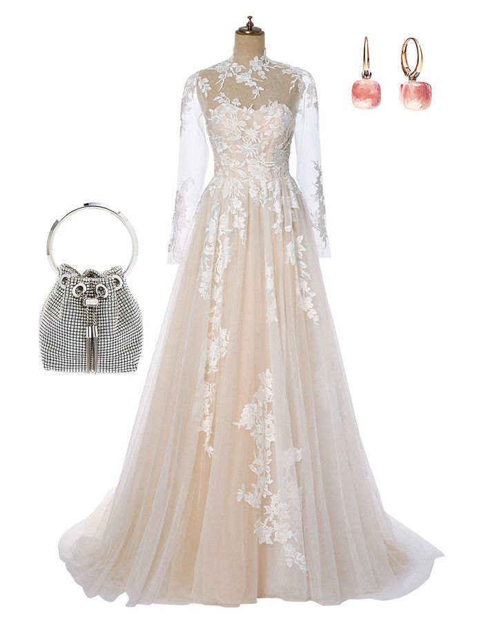 肌を覆うことで花嫁の清楚さや品のよさを表現できるロングスリーブのドレス。素材の持つハリや雰囲気でも印象が変わります。
