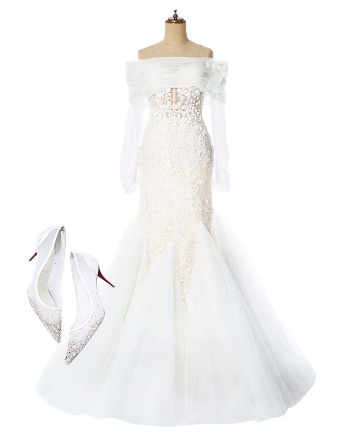 フロントはシャープなユミライン、背面は優美なAラインのシルエットに仕上げた一着。ジレやケープ、トレーンは取り外しが可能。ドレス¥418,000[販売価格] ジレ¥104,500[販売価格](2点共ユミカツラ プレタクチュール/ユミカツラ東京店3階 tel.03-3403-7867) 靴[H8.5]¥242,000(クリスチャン ルブタン/クリスチャン ルブタン ジャパン) ブーケ(アルマ マルソー tel.03-3944-1688)