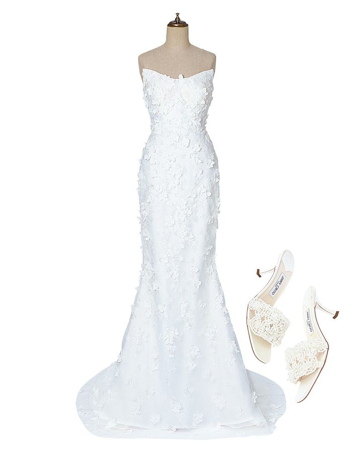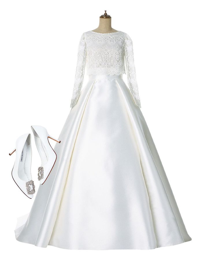 ミカド素材のAラインドレスは、トップ部分を覆うようにデザインされたレースに清楚な魅力が宿るデザイン。職人技が感じられる繊細なレースから、肌をほんのりと透けさせて。ドレス¥385,000[レンタル価格](ロサ・クララ/ギャレリアコレクション銀座店 tel.03-5159-6362) 靴[H9]¥232,100(マノロ ブラニク/ブルーベル・ジャパン tel.03-5413-1050)