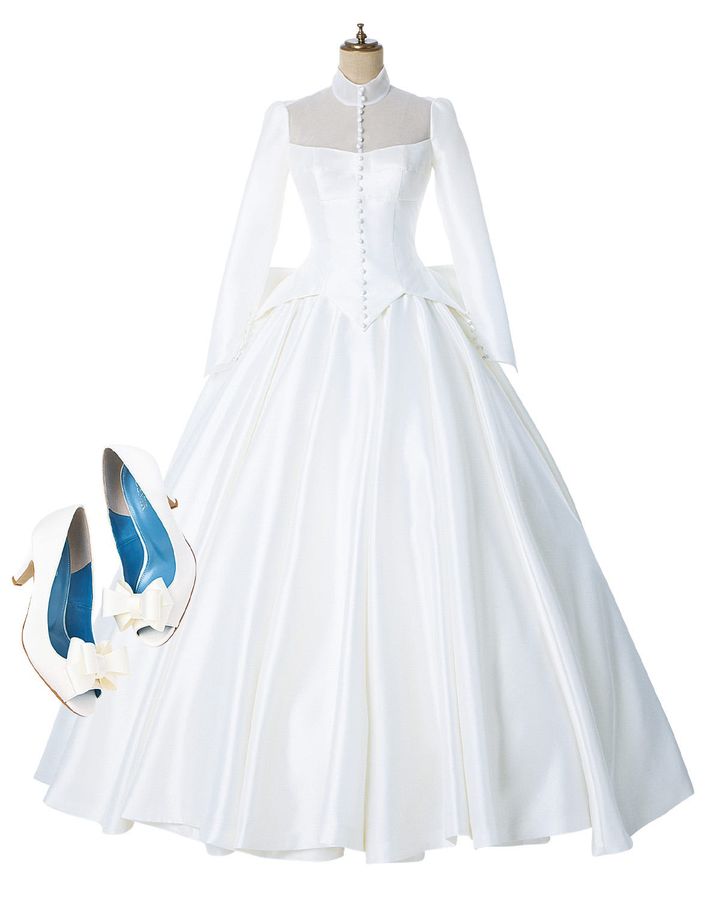 ブランド独自のテクニックであるクールカッティングを駆使することで、シンプルでありながらも立体感あるシルエットに。上質なミカドならではの光沢に、品のよさが感じられます。ドレス¥583,000[レンタル価格](エマリーエ/エマリーエ ウエディングドレスサロン tel.03-6804-3090) 靴[H7]¥28,050 リボンアクセサリー¥2,750(2点共ベニル tel.078-222-0511)