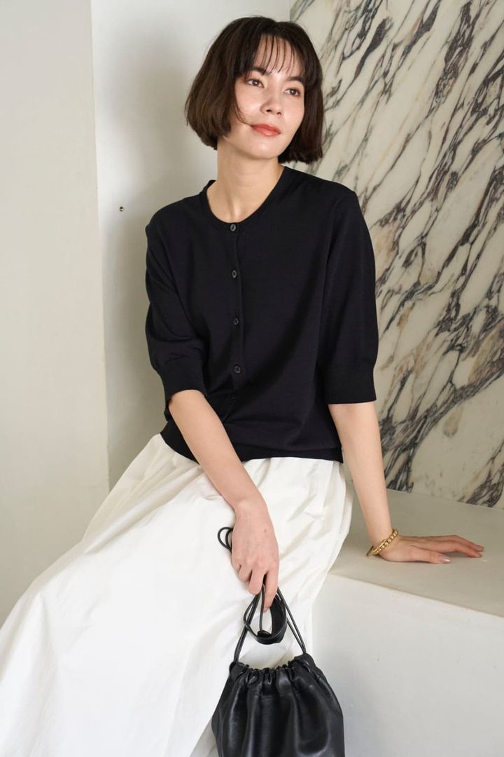ハーフスリーブのカーディガン。女性らしいシルエットでコーデに可愛さをプラス。どんなコーデにも合う頼れる一着。綺麗なシルエットを維持してくれる素材で、キレイ見え抜群。