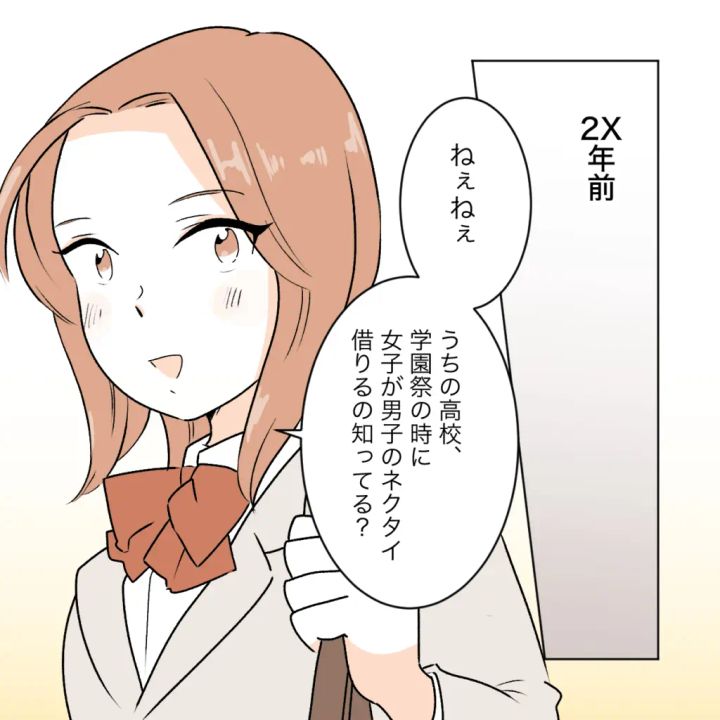 「ねぇねぇ、うちの高校、学園祭の時に女子が男子のネクタイ借りるの知ってる?」とカエデはワタルに聞いてみました。内心ではドキドキしながら。