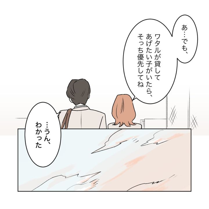 「あ・・・でも、ワタルが貸してあげたい子がいたら、そっち優先してね。」とカエデが言うと、「・・・うん、わかった」とワタルが答えて、2人は『いい感じ』のままハッキリ気持ちを伝えられずに、並んで帰宅しました。