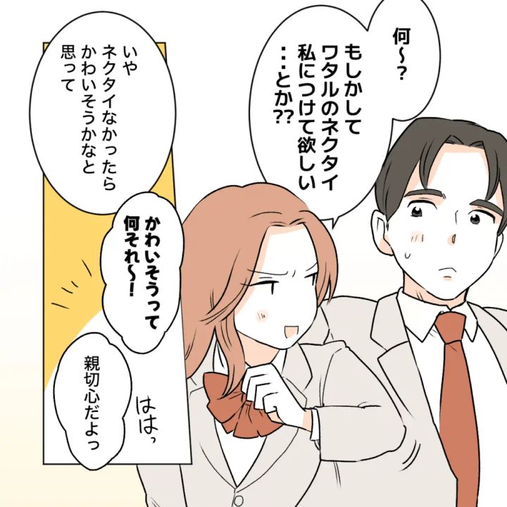照れ隠しで、カエデが「何~?もしかしてワタルのネクタイ私につけて欲しい・・・とか?」と言うと、「いや、ネクタイ無かったら可哀想かなと思って。」とワタル。「かわいそうって何それ~!」「親切心だよっ」冗談と本気の間を抜け出せない2人です。