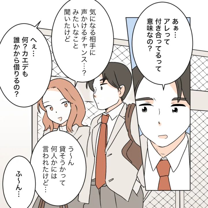 「あぁ。あれって付き合ってるって意味なの?」素直で真面目なワタルが言われて、「気になる相手に声かけるチャンス・・・?みたいなこと聞いたけど」とカエデが説明すると「へぇ。何?カエデも誰かから借りるの?」とワタル。カエデは「う~ん。貸そうかって何人かには言われたけど・・・」ワタルにははっきり言い出せず、遠回しに答えるカエデです。