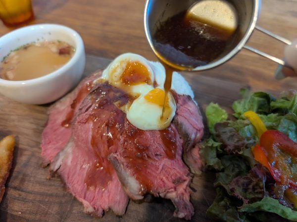 店内を楽しんでいると「自家製ローストビーフプレート」の登場。 ごはんの上に敷き詰められたローストビーフはまるでマウンテン! めっちゃ美味しそう。